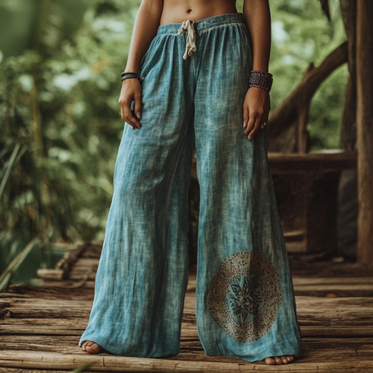 Vintage Bohemian Holiday Style Floral Art Printed Cotton Linen Wide Leg Pants dde9
