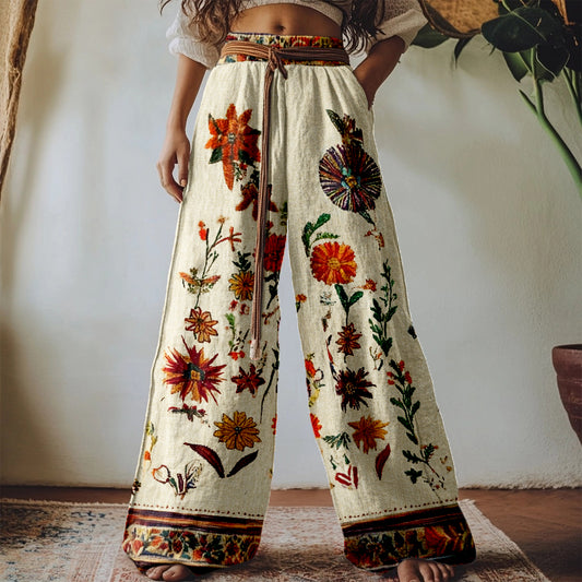 Vintage Floral Embroidered Linen Blend Comfy Pants 9ffe