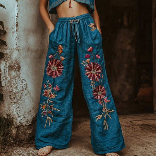 Women's Retro Linen Boho Flowers Art Long Loose Wide-leg Trouser Pants 224c