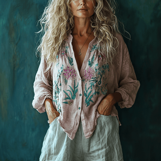 Women's Bohemian Linen Style Button-down Loose Long-sleeved Long-sleeve Top Shirt