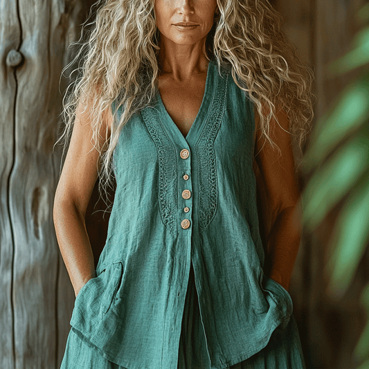 Women's Casual Bohemia V-neck Linen Ethnic Style Sleeveless Vest Top Shirt