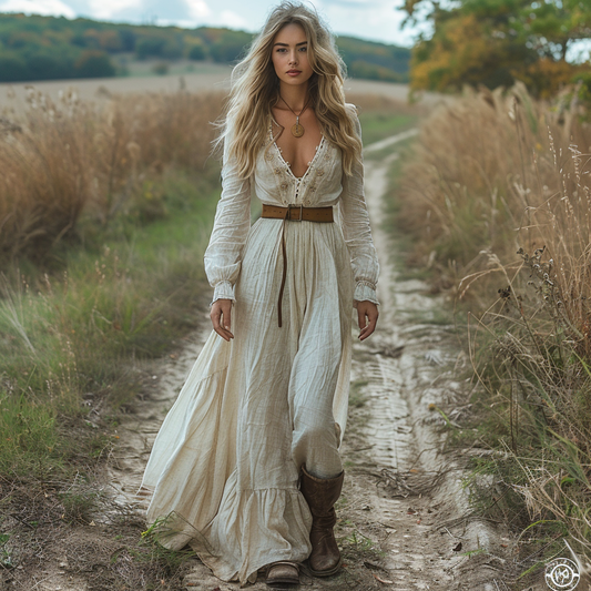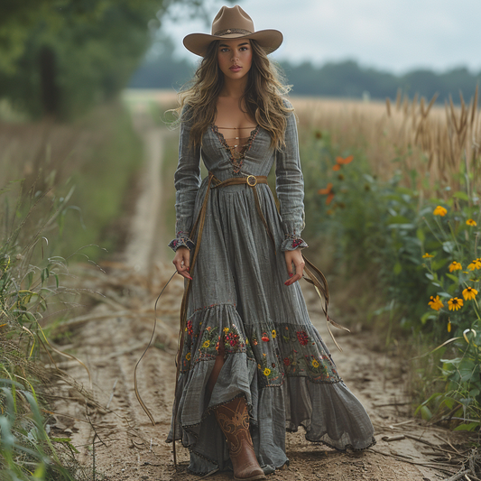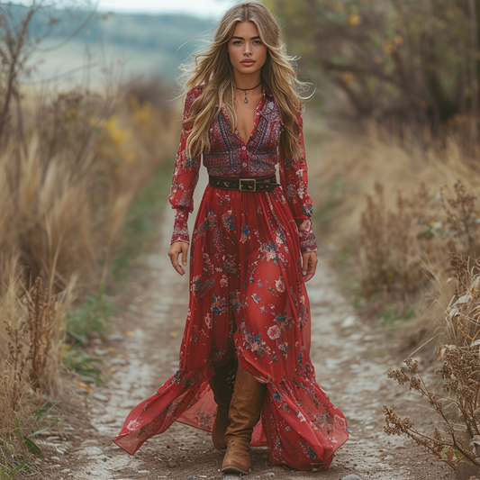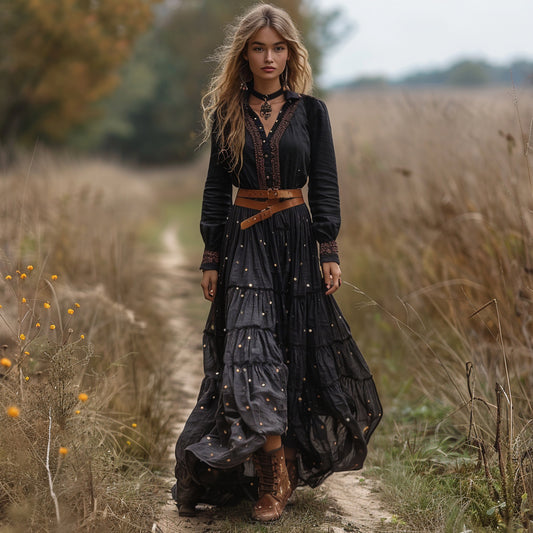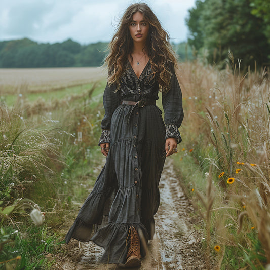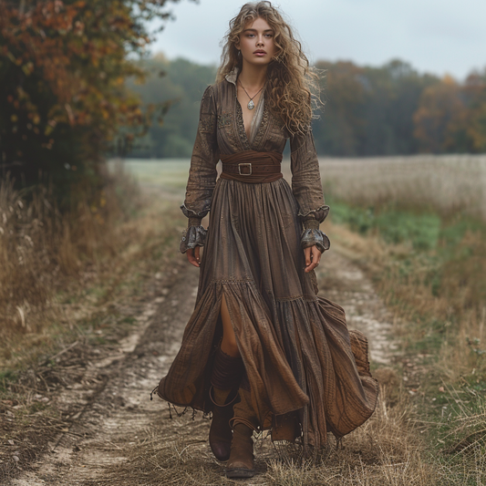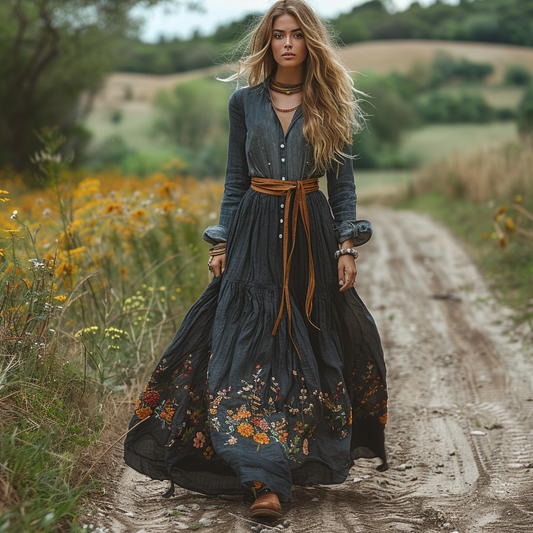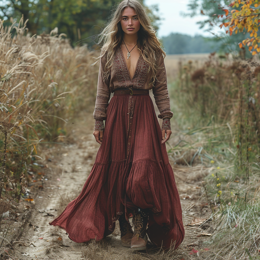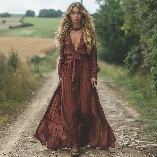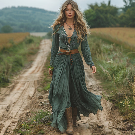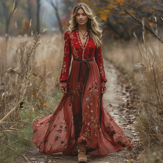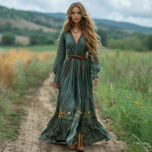 Women's Vintage V-neck Bohemian Pastoral Style Long-sleeved Maxi Long Dress