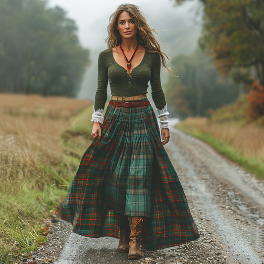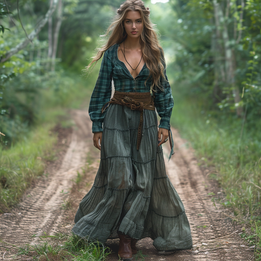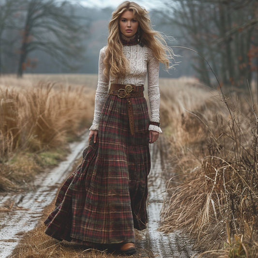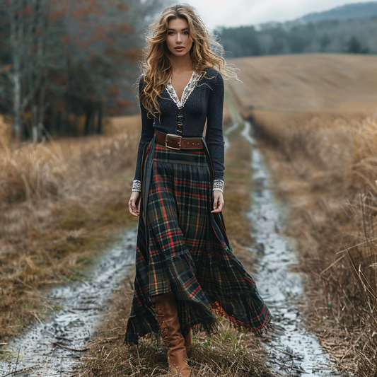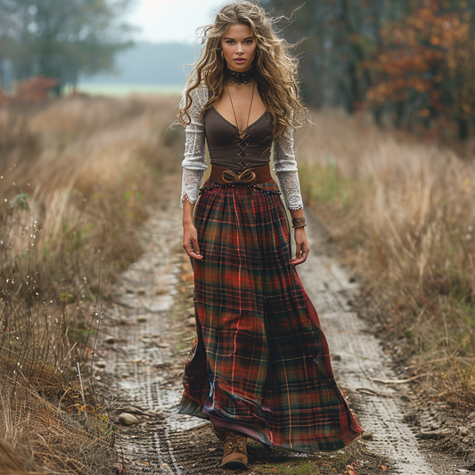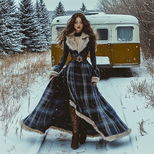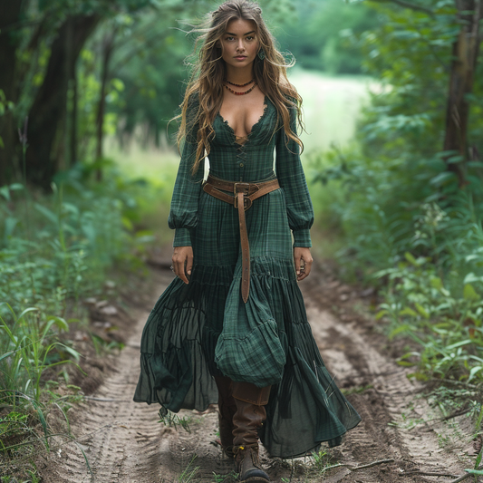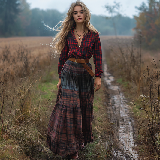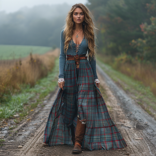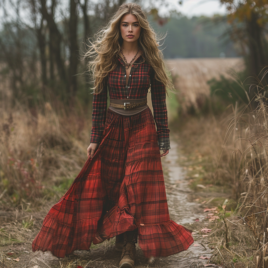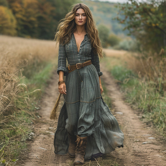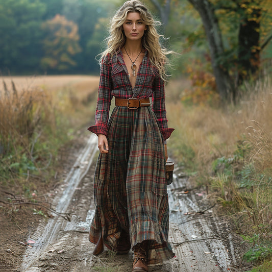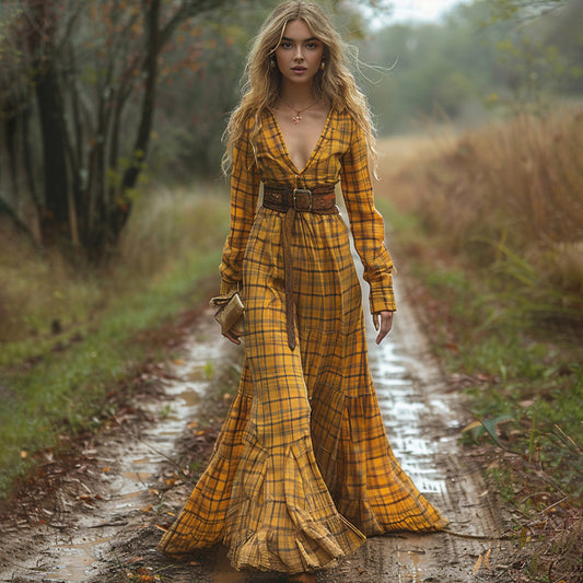 Women's Retro Pastoral Style Plaid Long-sleeve Sexy Maxi Long Dress