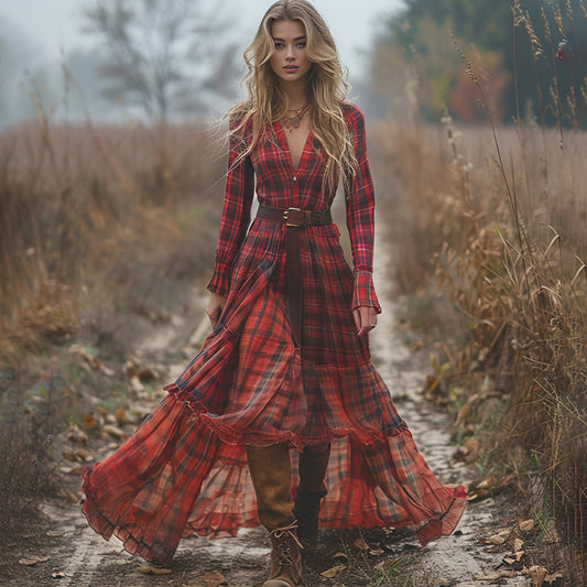 Women's Vintage V-neck Bohemian Pastoral Plaid Style Long-sleeve Maxi Long Dress