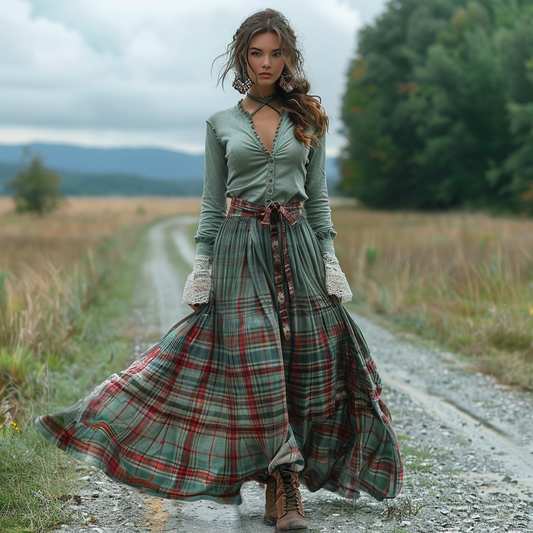 Women's Retro Plaid V-neck Long-sleeve Long Skirt Pastoral Style Maxi Long Dress