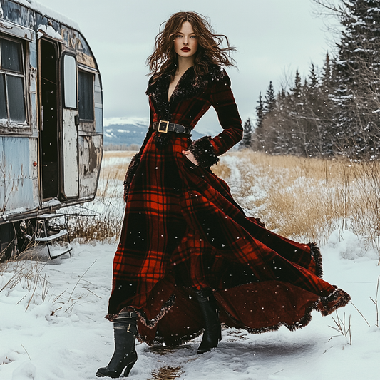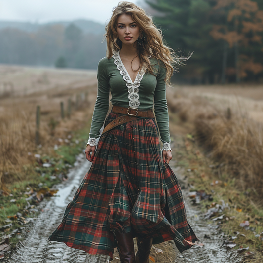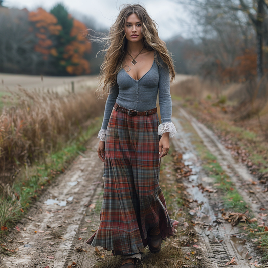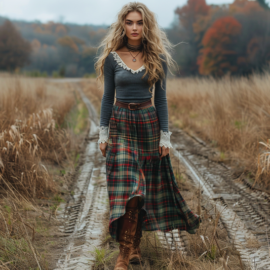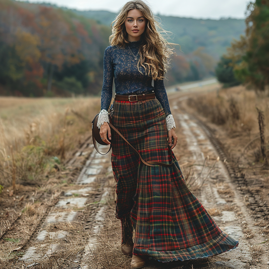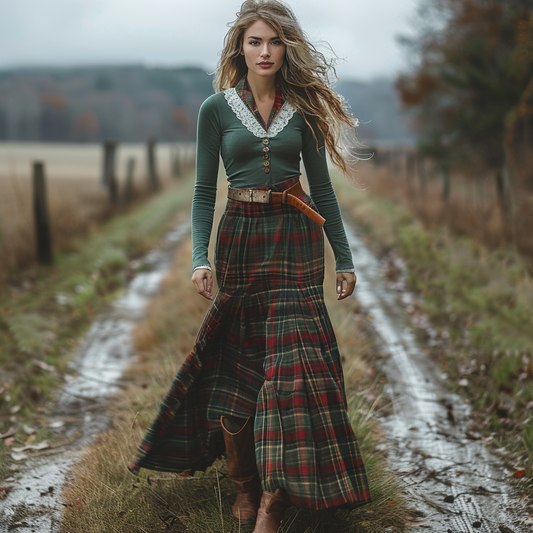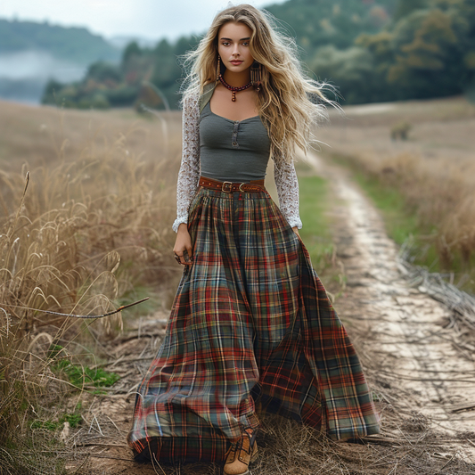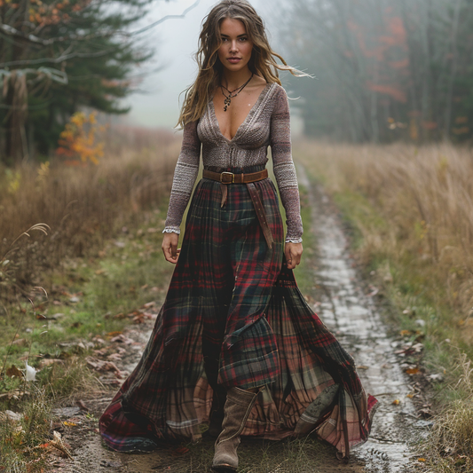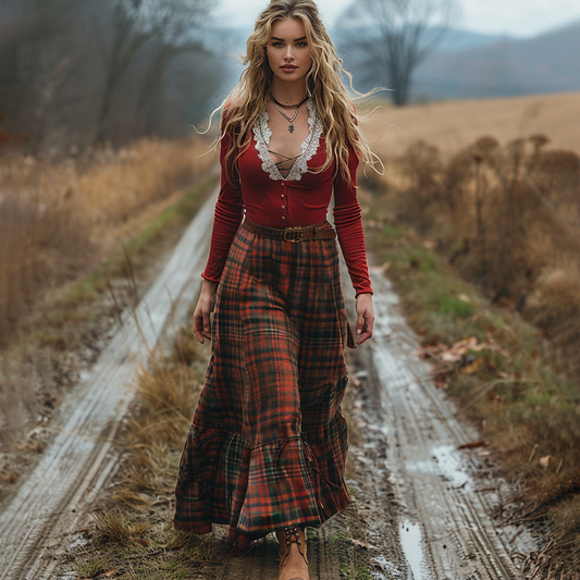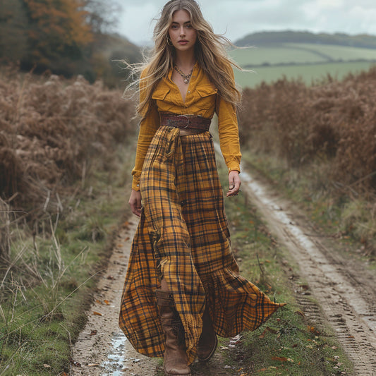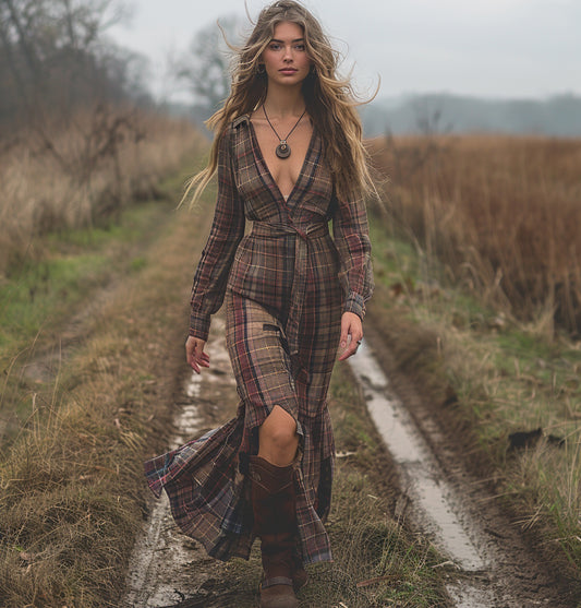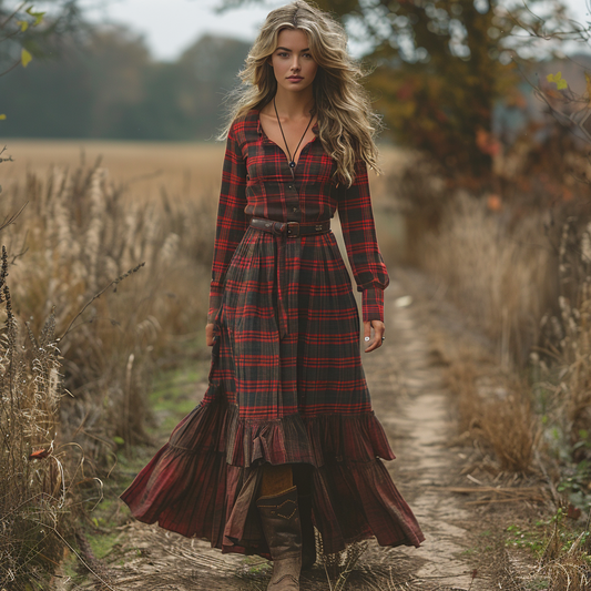 Women's Retro Pastoral Style Plaid Long-sleeve Sexy Maxi Long Dress