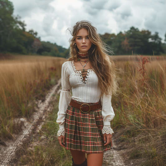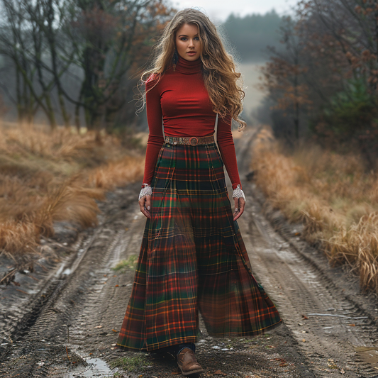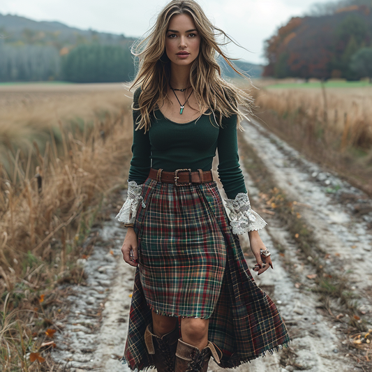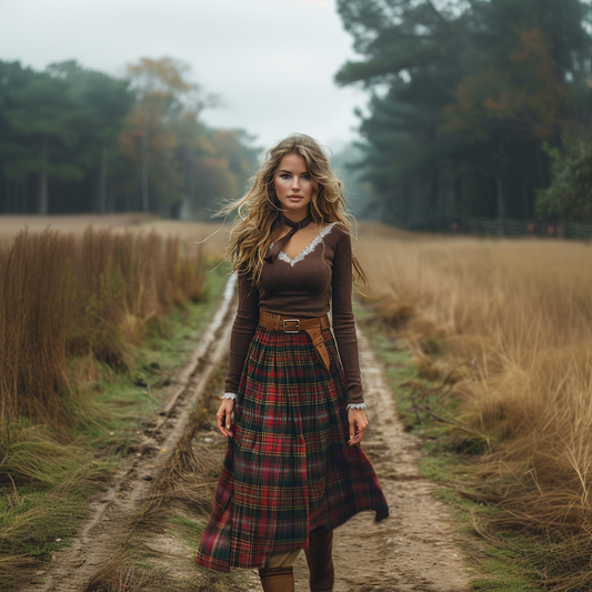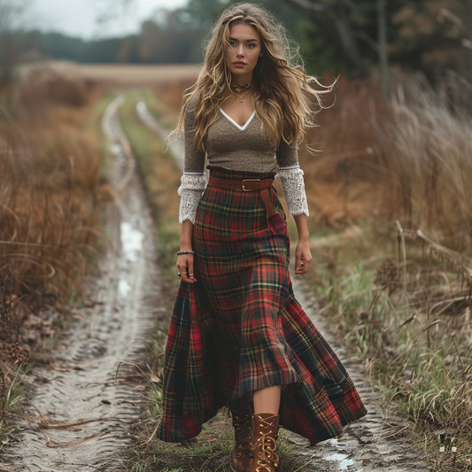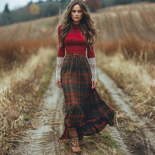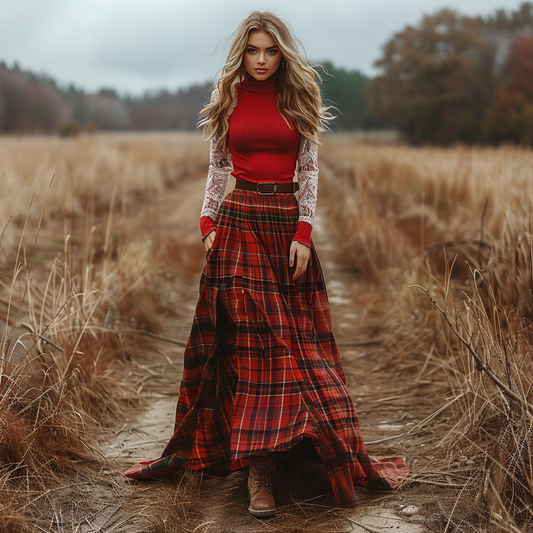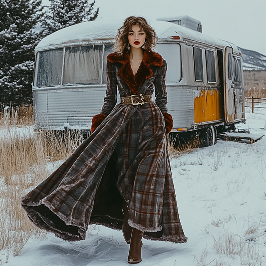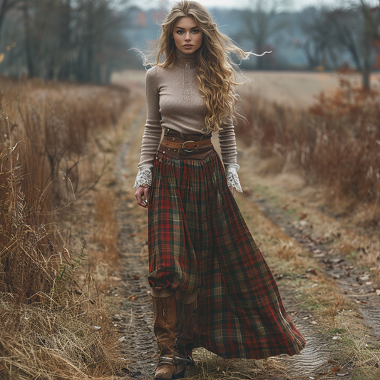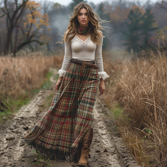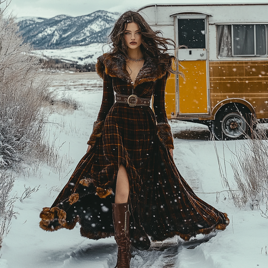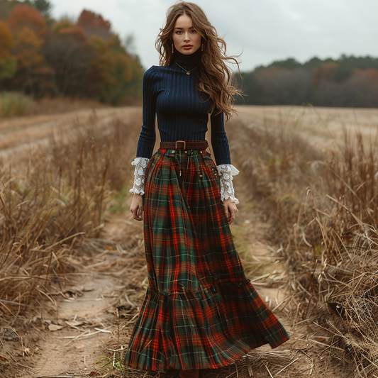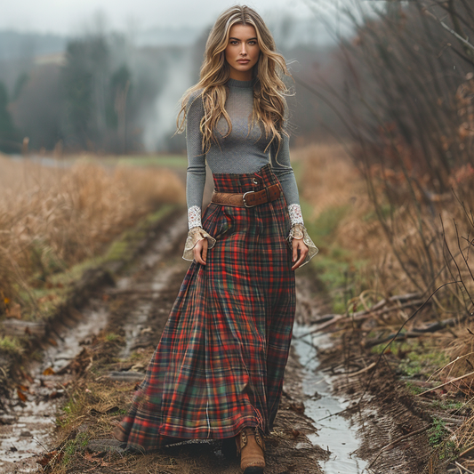 Women's Retro Pastoral Style Plaid Long-sleeve Sexy Maxi Long Dress