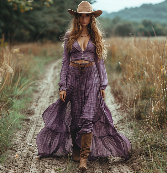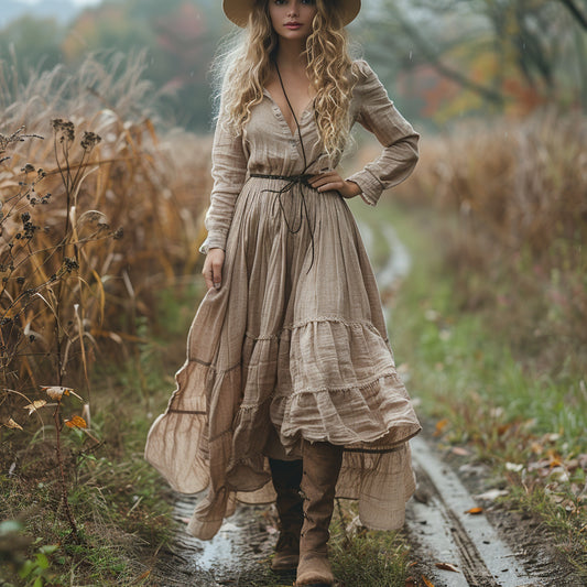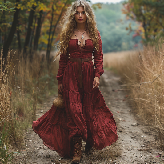 Women's Vintage V-neck Bohemian Pastoral Style Long-sleeved Maxi Long Dress
