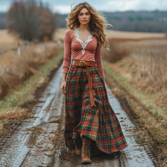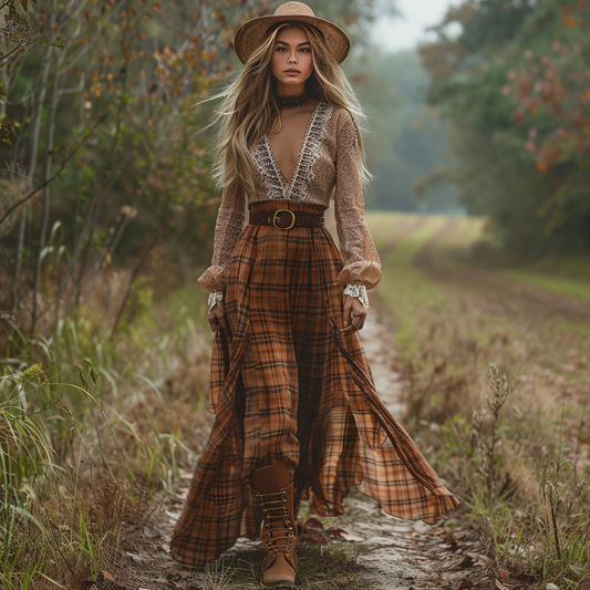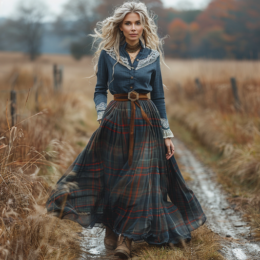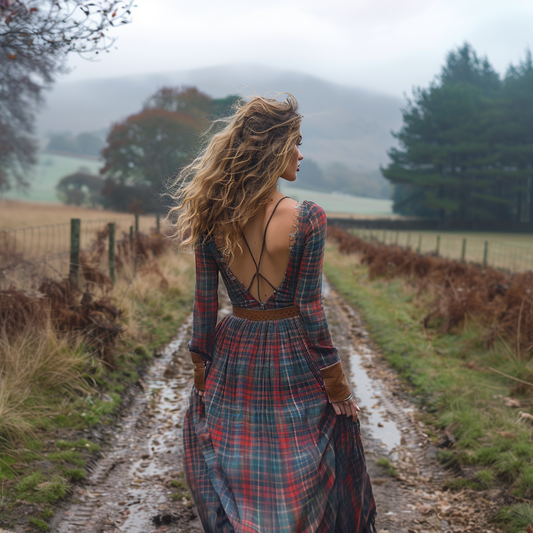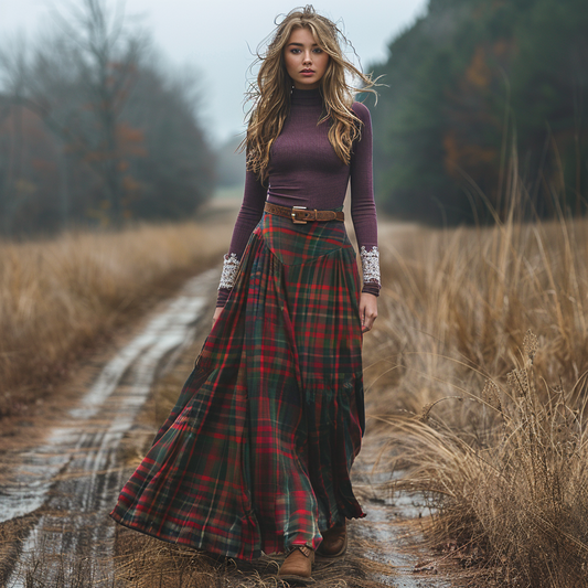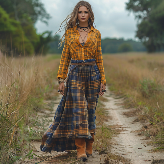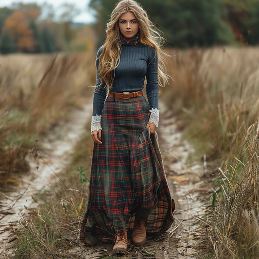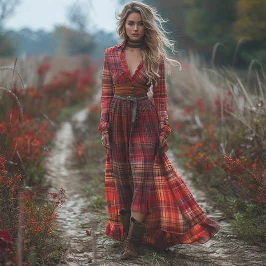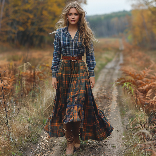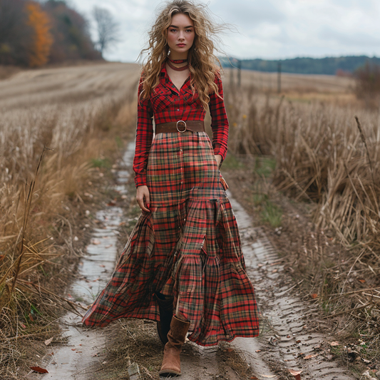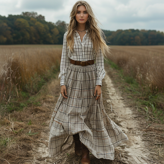 Women's Retro Pastoral Style Plaid Long-sleeve Sexy Maxi Long Dress