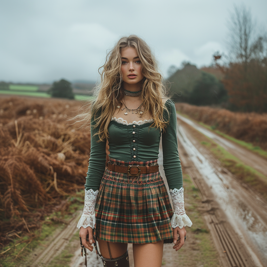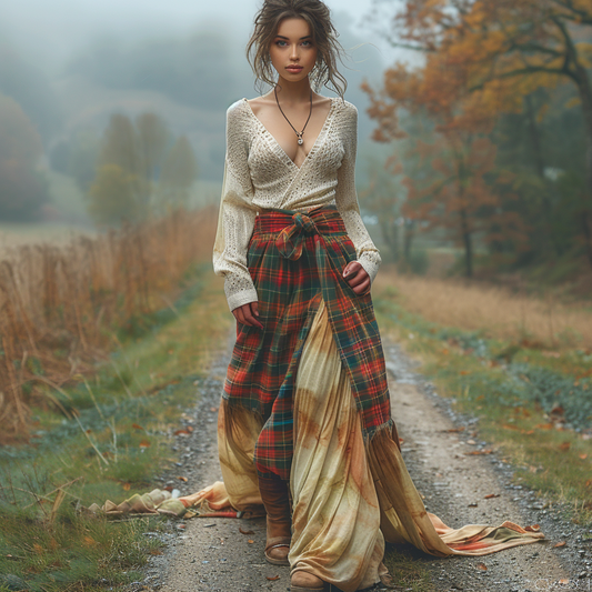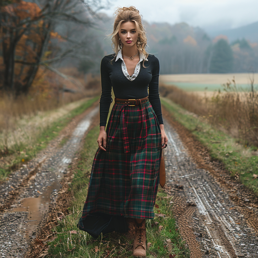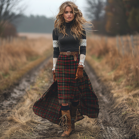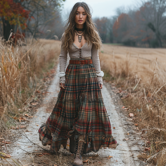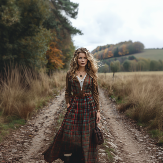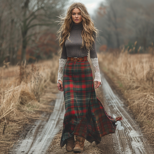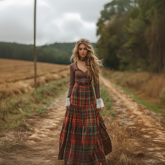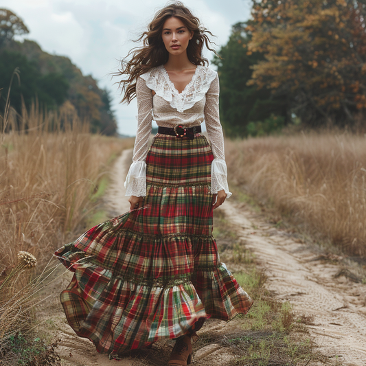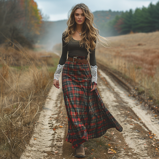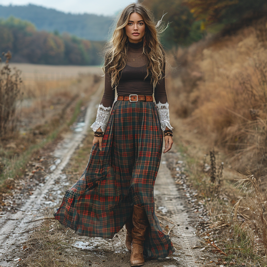 Women's Retro Pastoral Style Plaid Long-sleeve Sexy Maxi Long Dress