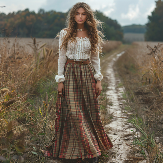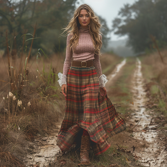 Women's Retro Round Neck Long-sleeve Long Skirt Plaid Pastoral Style Maxi Long Dress
