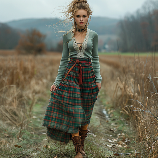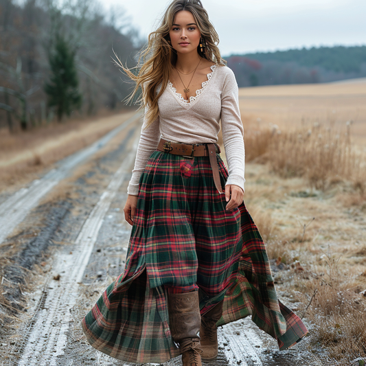 Women's Retro Plaid V-neck Long-sleeve Long Skirt Pastoral Style Maxi Long Dress