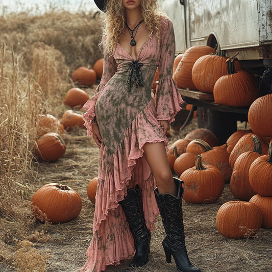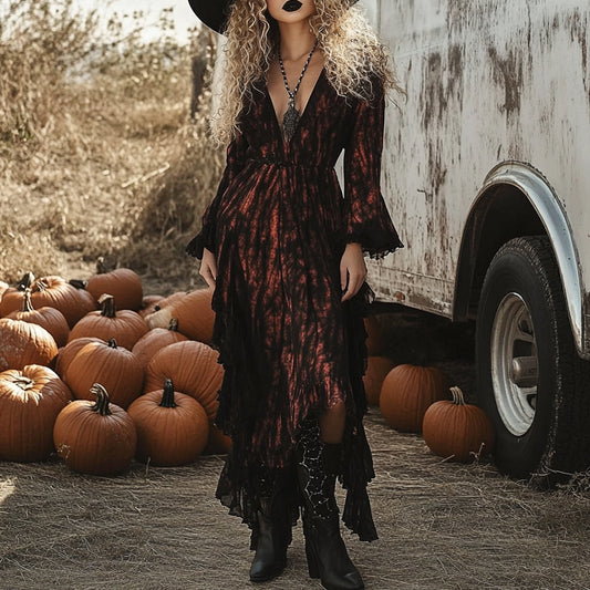 Women's Vintage Halloween Western Style Elegant Long-sleeve Midi Long Dress