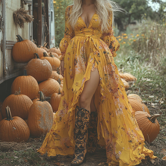 Women's Vintage Halloween Western Style Elegant Long-sleeve Maxi Long Dress
