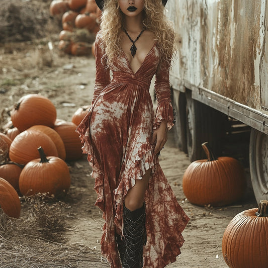 Women's Halloween Witch Style Tie-dye Long-sleeve Midi Long Dress