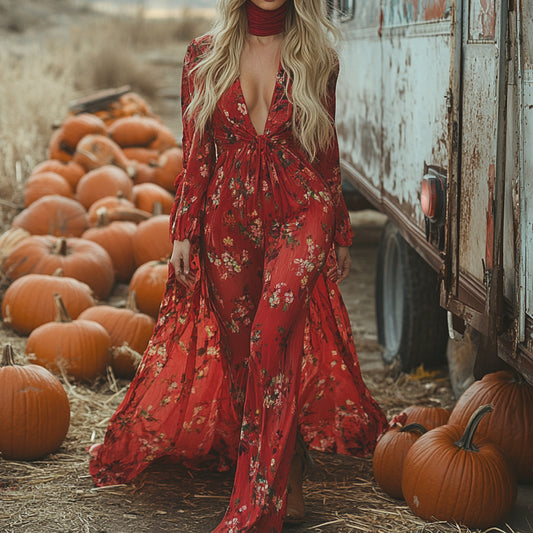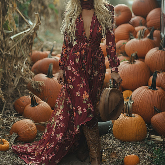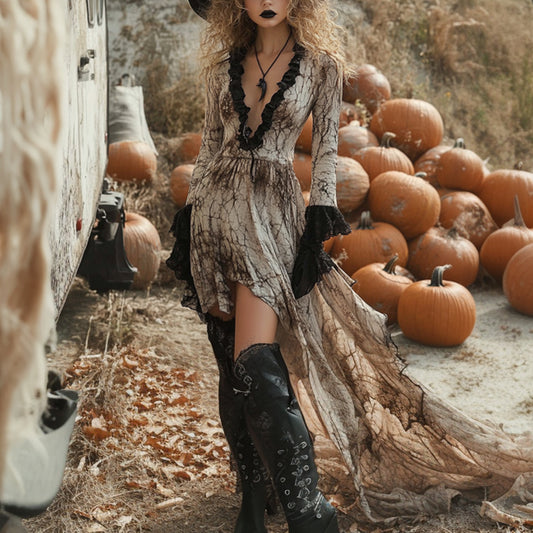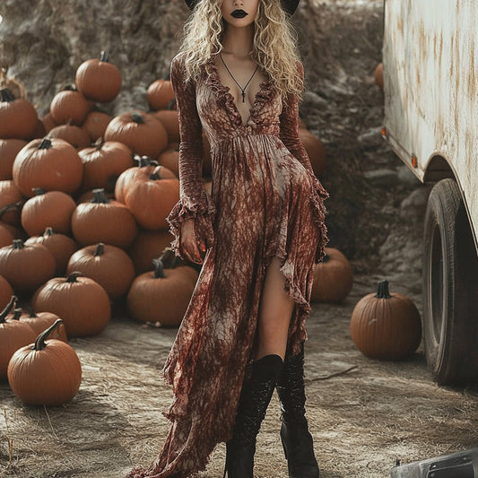 Women's Vintage Halloween Western Style Elegant Long-sleeve Midi Long Dress