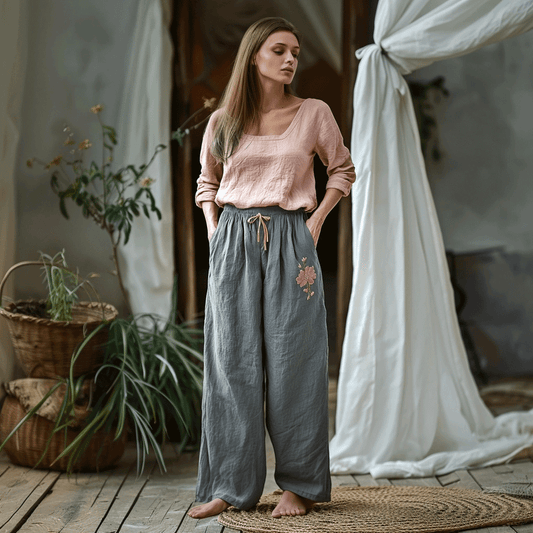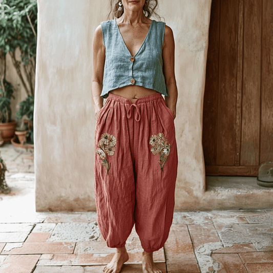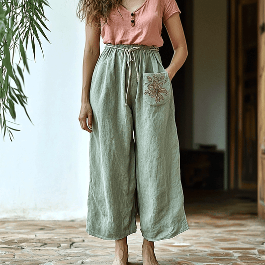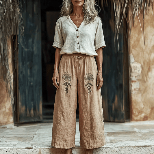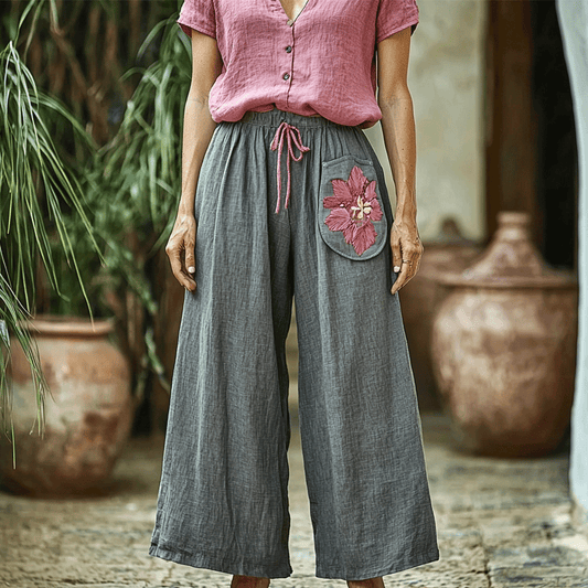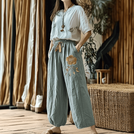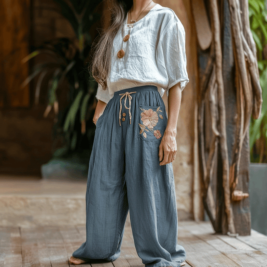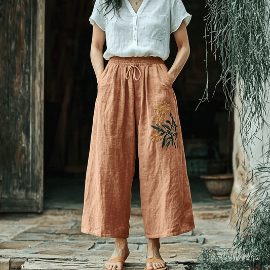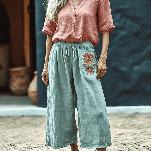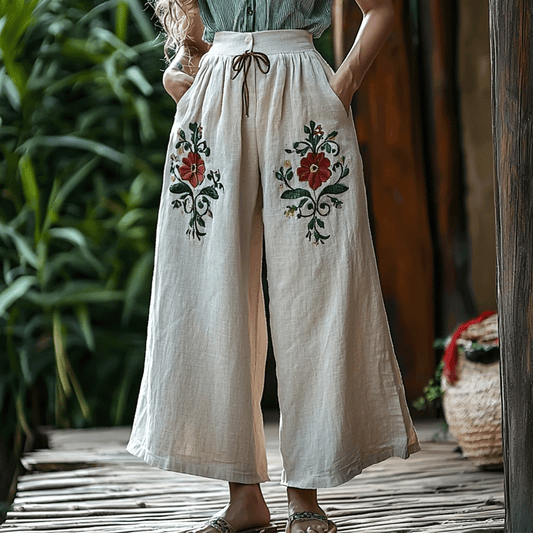 Women's Linen Bohemian Style Floral Wide-leg Trousers Pants