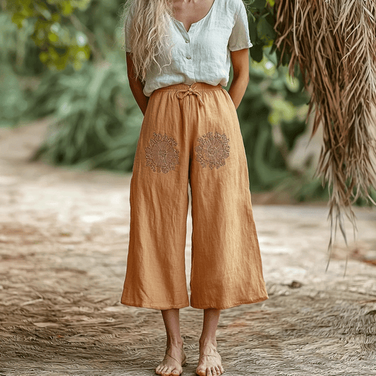 Women's Linen Wide-leg Ethnic Floral Casual Cropped Trouser Pants