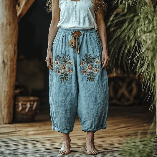 Women's Linen Bohemian Ethnic Floral Cropped Trouser Pants