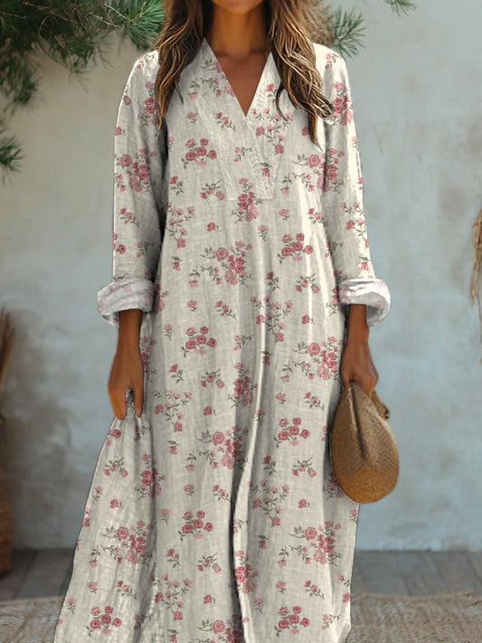Women's Folk Floral Art Print V Neck Pocket Cotton Dress