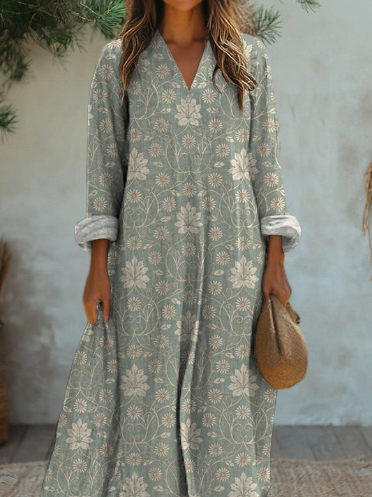 Women's Linen Loose Leaf Print Midi Dress Long Sleeve Pocket Dress
