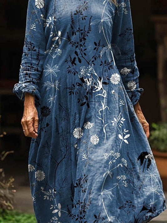 Women's Bohemian Floral Print Crew Neck Pocket Cotton Dress