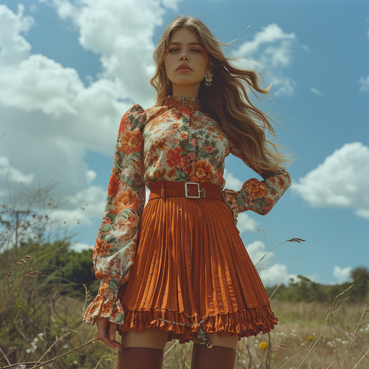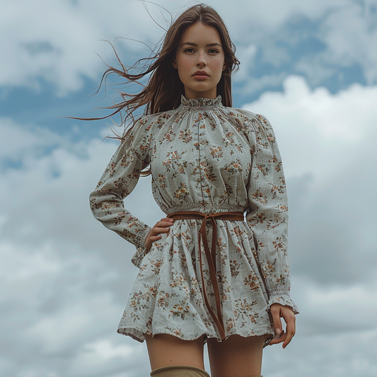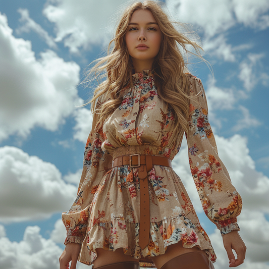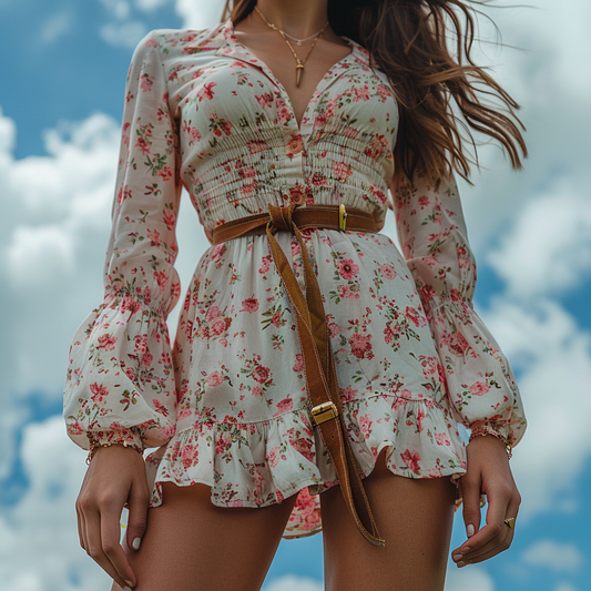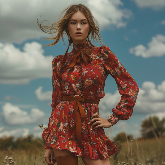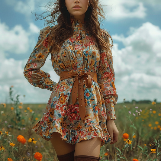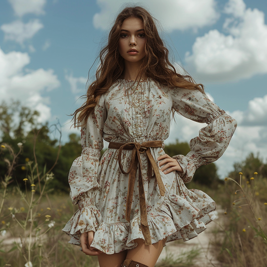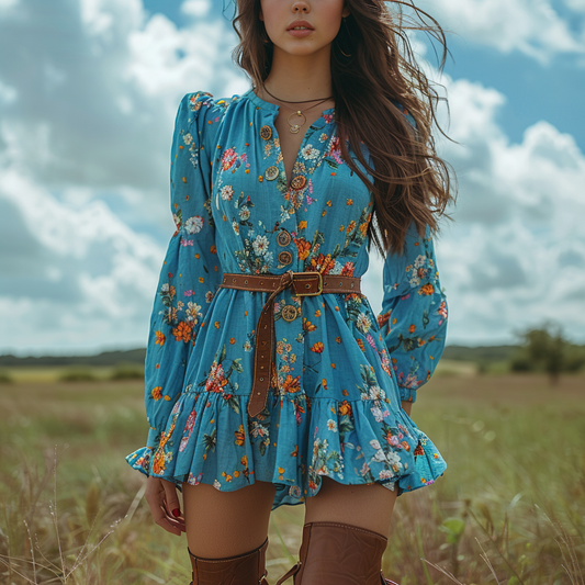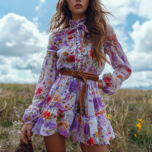 Women's Retro Floral Bohemian Pastoral Style Long-sleeved Mini Short Dress