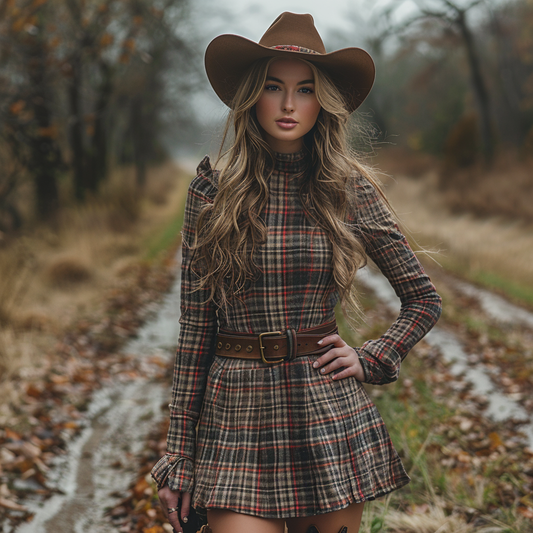 Women's Retro Plaid Pastoral Denim Style Long-sleeve Mini Short Dress