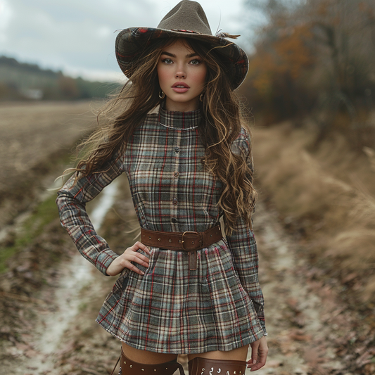 Women's Retro Plaid Pastoral Style Long-sleeve Short Dress