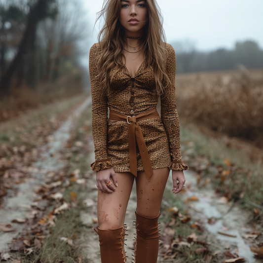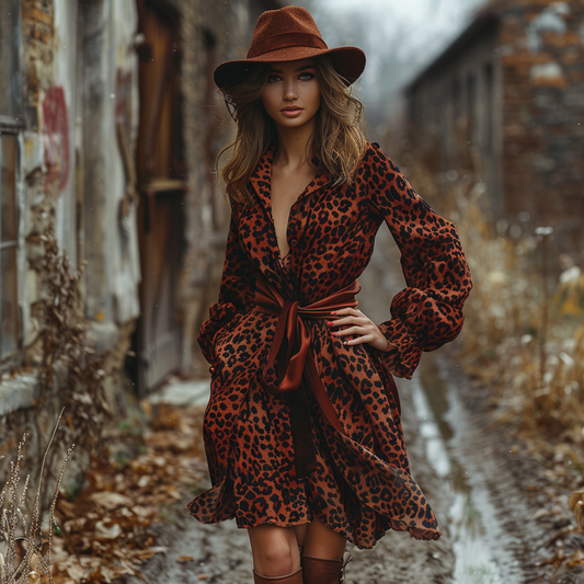 Women's Retro Pastoral Leopard Style Long-sleeve Short Skirt Dress