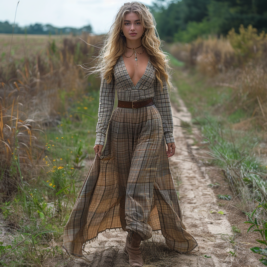 Women's Retro V-neck Plaid Long-sleeve Bohemian Pastoral Style Maxi Long Dress