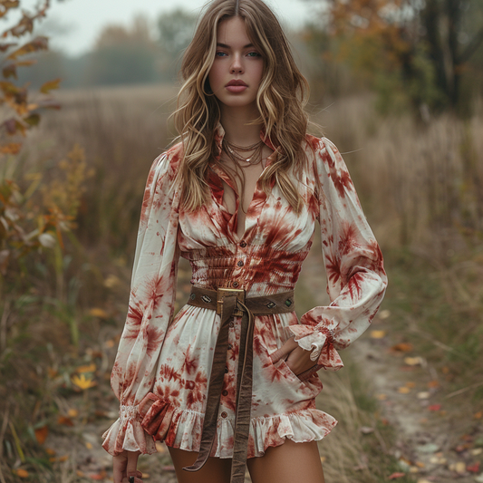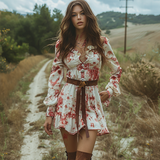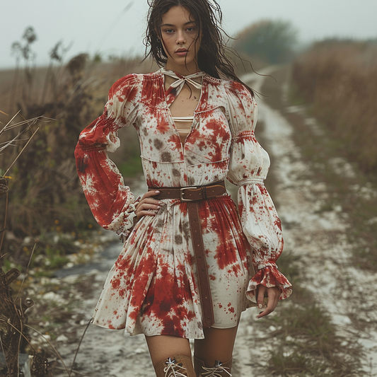 Women's Retro V-neck Tie Dye Halloween Party Long-sleeve Mini Short Dress