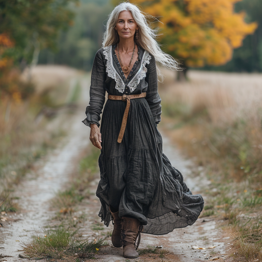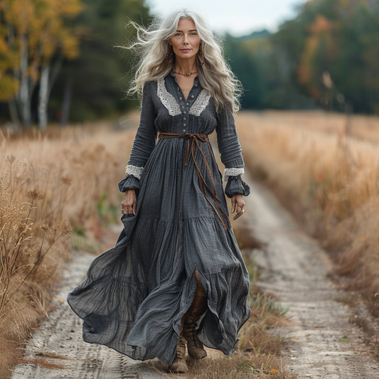 Women's Retro Pastoral Style Lace Long-sleeve Sexy Maxi Long Dress