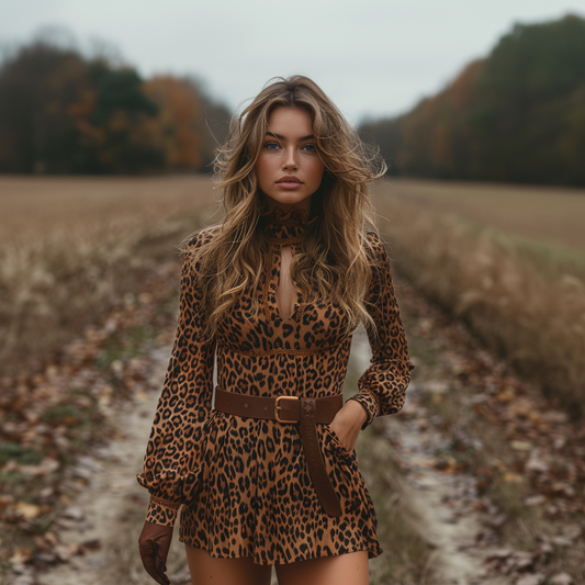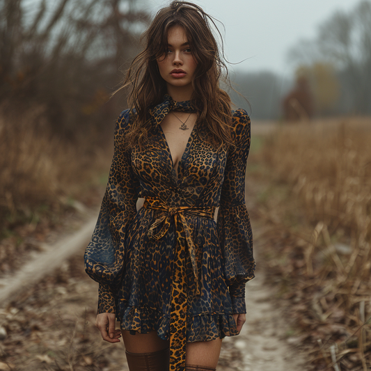 Women's Retro Pastoral Leopard Style Long-sleeve Short Skirt Dress