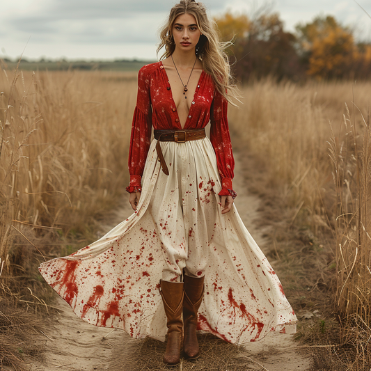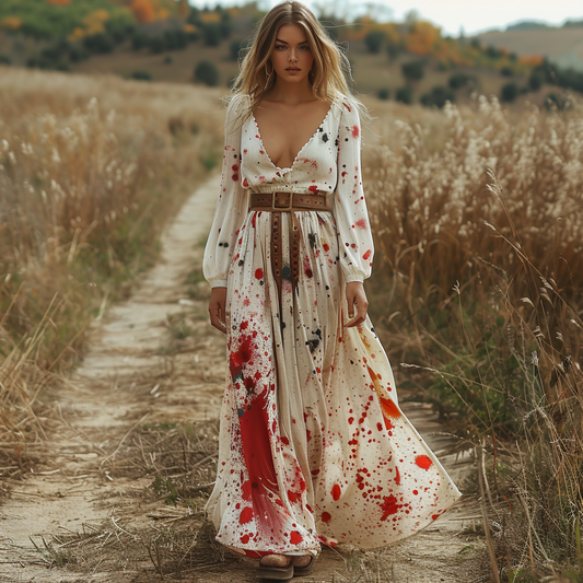 Women's Retro V-neck Pastoral Halloween Party Style Long-sleeve Maxi Long Dress