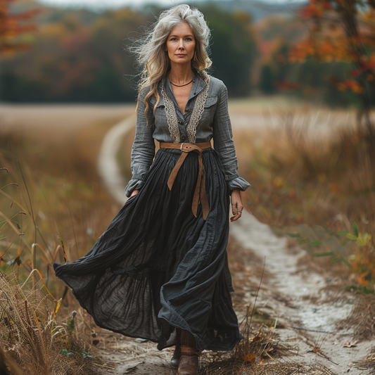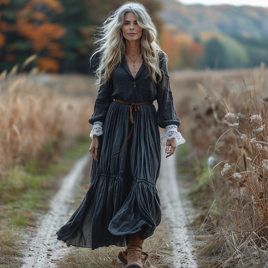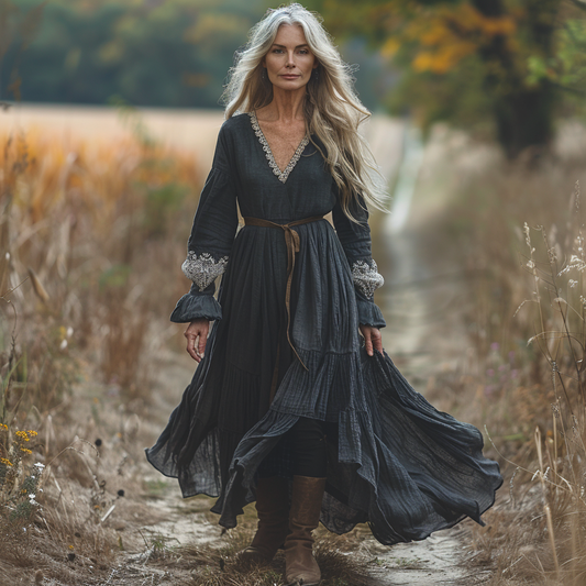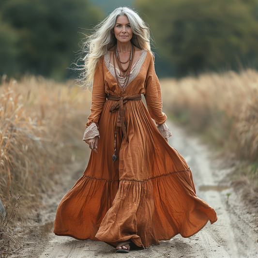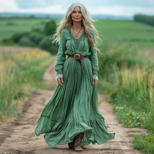 Women's Retro V-neck Country Pastoral Linen Style Long-sleeve Casual Maxi Long Dress