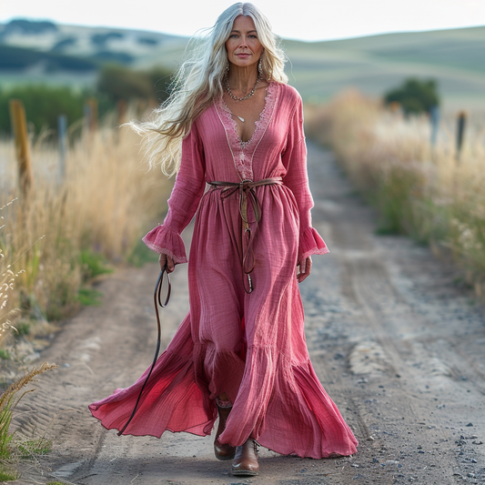 Women's Vintage V-neck Linen Long-sleeve Maxi Long Dress