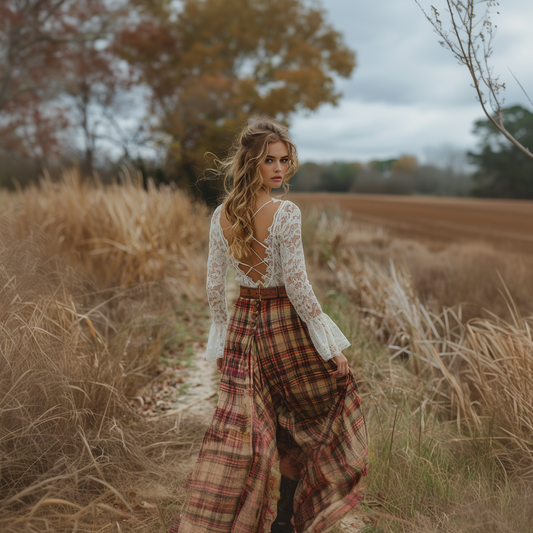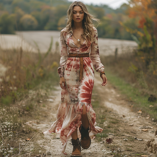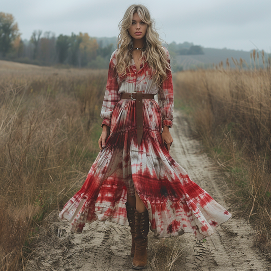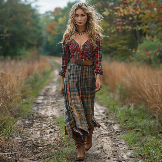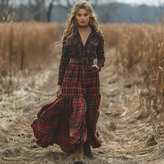 Women's Retro V-neck Plaid Long-sleeve Bohemian Pastoral Style Maxi Long Dress