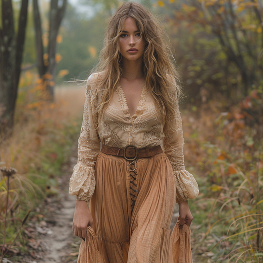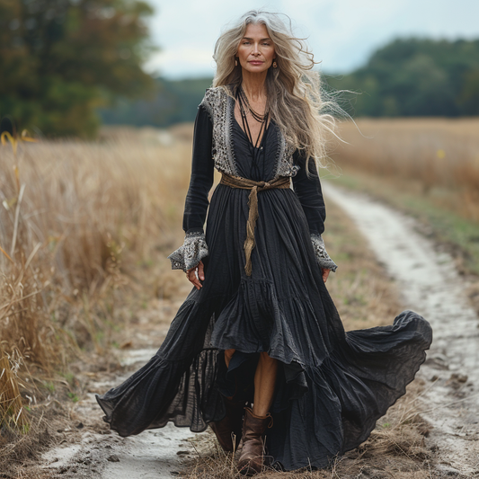 Women's Retro Pastoral Style Lace Long-sleeve Sexy Maxi Long Dress