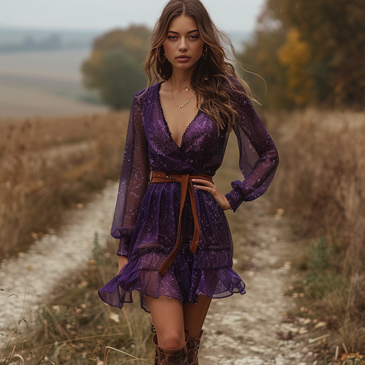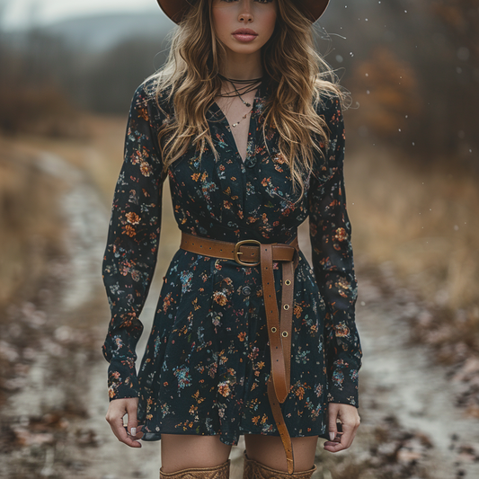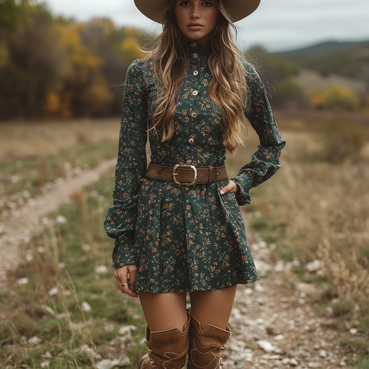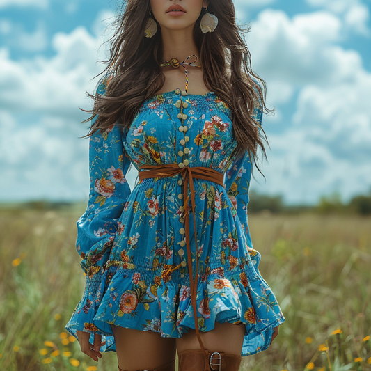 Women's Retro Floral Bohemian Pastoral Style Long-sleeved Mini Short Dress