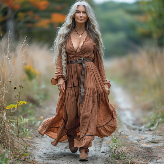 Women's Vintage V-neck Linen Long-sleeve Maxi Long Dress