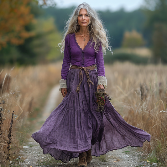Women's Retro Country Pastoral Linen Style Long-sleeve Casual Maxi Long Dress